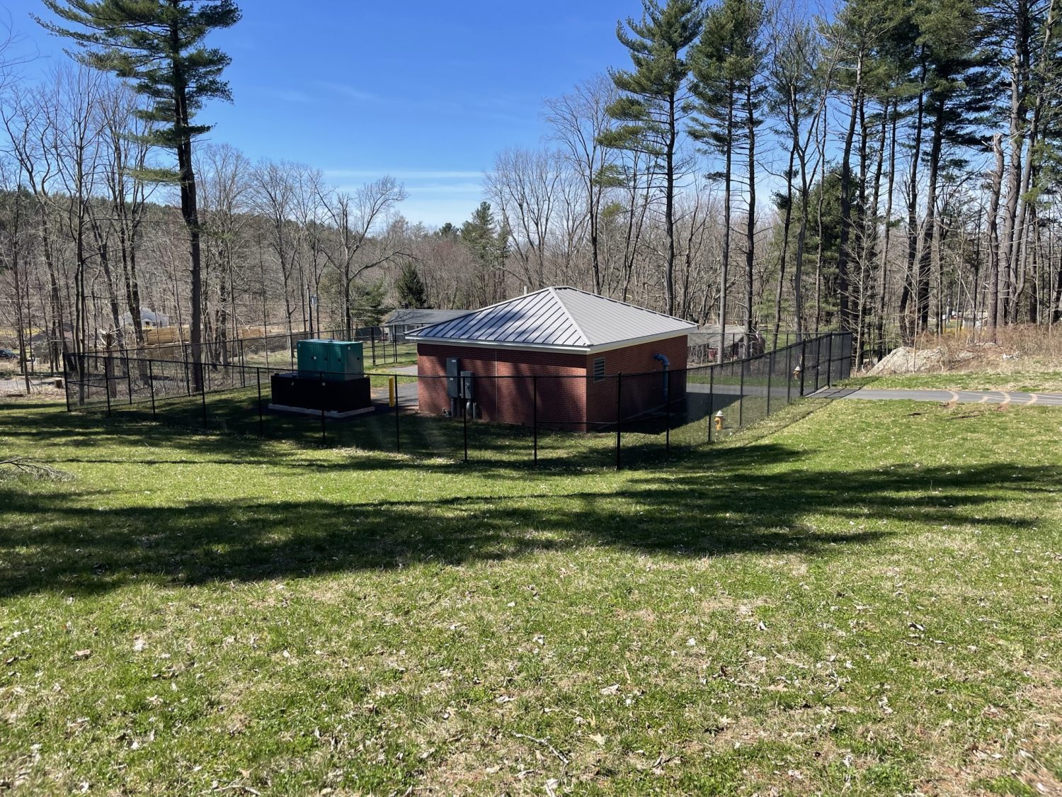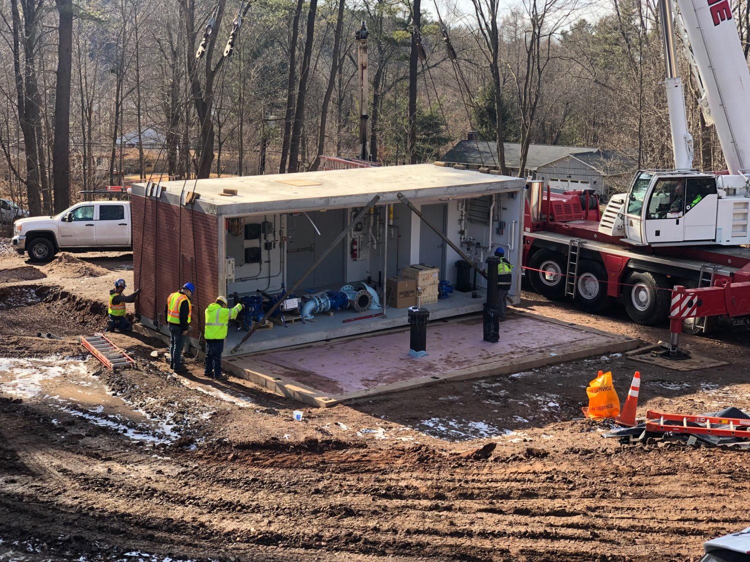Spazzarini Construction Co., LLC. was contracted for the site work associated with a new Connecticut Water Company Pump Station located in Somers CT. This Contract included the installation of the building foundation, 12” DIP connection to new Water Main in road, and the installation of Building Utilities for the new station. Spazzarini Construction was also contracted to install the prefabricated pump station manufactured by United Concrete. This fully assembled building shipped on 4 trailers and was installed by Bay Crane Inc. The Precast building weighed a total of 164,000 Lbs.